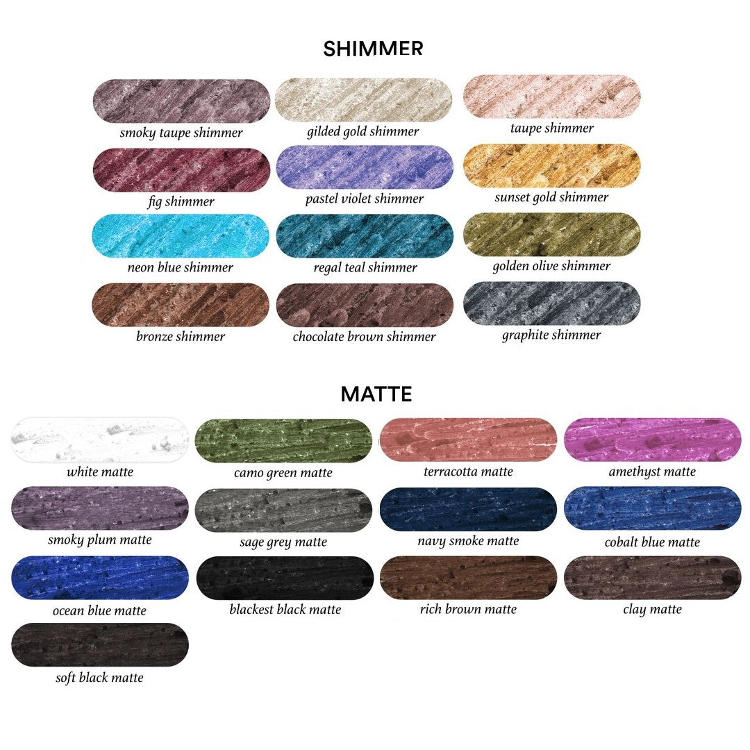Blackest Black Matte, Rich Brown Matte, Soft Black Matte, Camo Green Matte, Clay Matte, Smoky Plum Matte, Smoky Taupe Shimmer, Golden Olive Shimmer, White Matte, Chocolate Brown Shimmer, Graphite Shimmer, Navy Smoke Matte, Pastel Violet: ISODODECANE, MICA, SYNTHETIC WAX, HYDROGENATED POLYDICYCLOPENTADIENE, PEG/PPG-18/18 DIMETHICONE, POLYBUTENE, GLYCERYL TRIBEHENATE/ISOSTEARATE/EICOSANDIOATE, ETHYLENE/PROPYLENE COPOLYMER, NYLON-12, POLYGLYCERYL-4 DIISOSTEARATE/POLYHYDROXYSTEARATE/SEBACATE, SYNTHETIC BEESWAX, PENTAERYTHRITYL TETRA-DI-T-BUTYL HYDROXYHYDROCINNAMATE, COPERNICIA CERIFERA CERA / COPERNICIA CERIFERA (CARNAUBA) WAX / CIRE DE CARNAUBA. MAY CONTAIN / PEUT CONTENIR (+/-): TITANIUM DIOXIDE (CI 77891), IRON OXIDES (CI 77491, CI 77492, CI 77499), FERRIC AMMONIUM FERROCYANIDE (CI 77510), FERRIC FERROCYANIDE (CI 77510), MANGANESE VIOLET (CI 77742), ULTRAMARINES (CI 77007), BLUE 1 LAKE (CI 42090), BISMUTH OXYCHLORIDE (CI 77163), BLACK 2 (CI 77266), CHROMIUM OXIDE GREENS (77288), CARMINE (CI 75470).